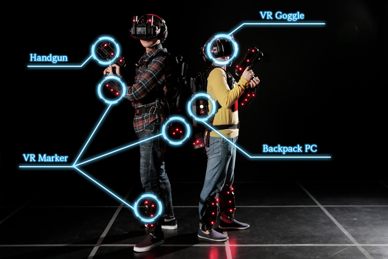 The game is hosted in a 20m X 12m arena with what VR Zone calls “a highly sophisticated multi-person full body tracking system.” The experience appears to use a modified HTC Vive headset with a number of positionally tracked pieces including a tracked pistol, forearm and shin guards. The system appears to use a different tracking standard to HTC’s Lighthouse system, instead using visible LED-based optical tracking. Wireless walking is achieved via backpack-mounted computers.