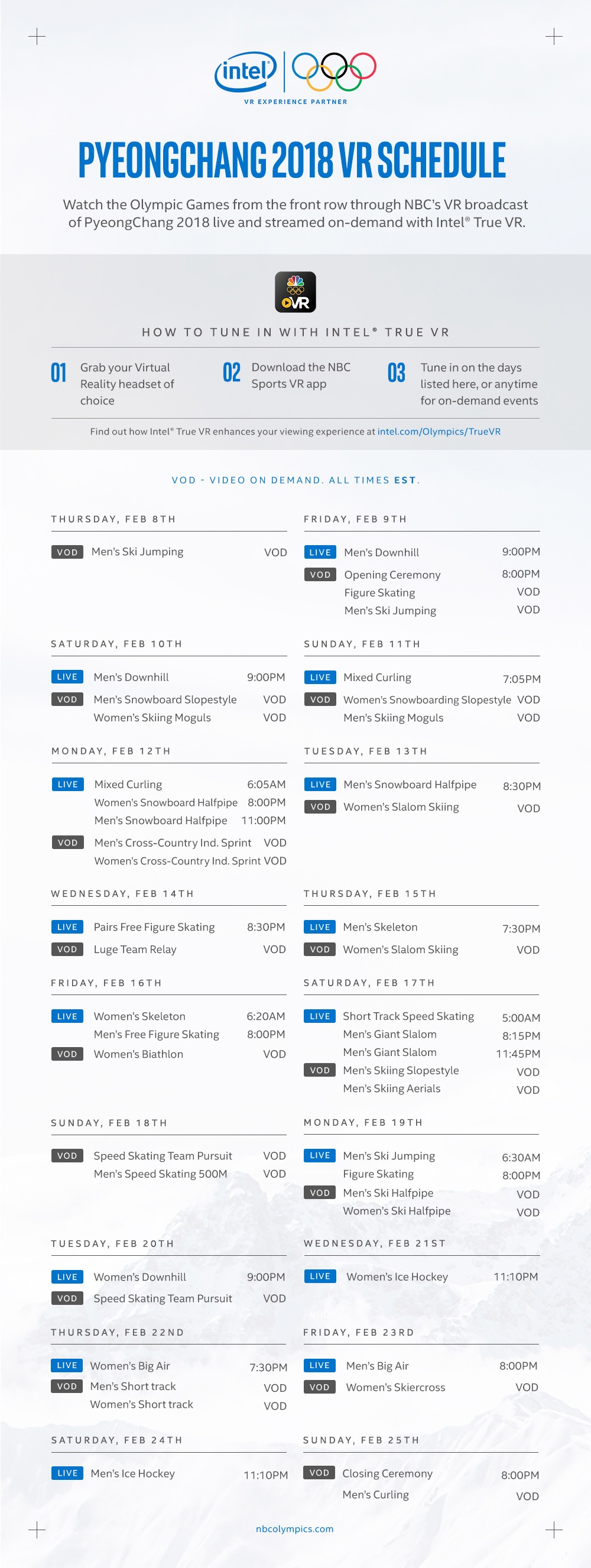 NBC has partnered with Intel to provide more than 50 hours of live virtual reality coverage through the NBC Sports VR app. On-demand video will be open to the public, while live streaming video will require you to authenticate your subscription with your pay TV provider, i.e. cable, satellite or digital operator.