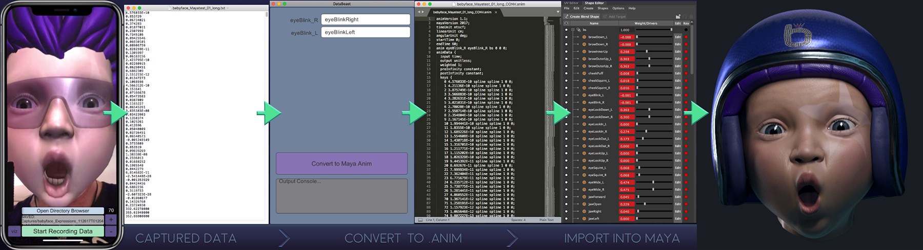 Here’s the capture process Strassburger outlined for taking the iPhone X facial capture data and using it to animate a character’s expressions in Maya: