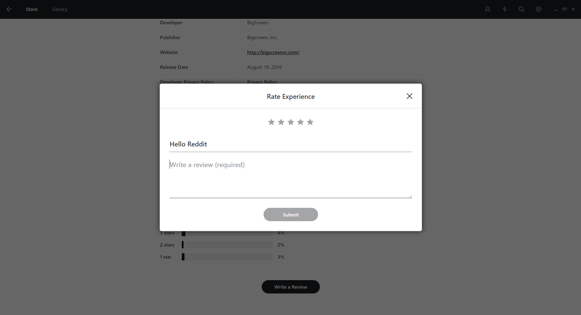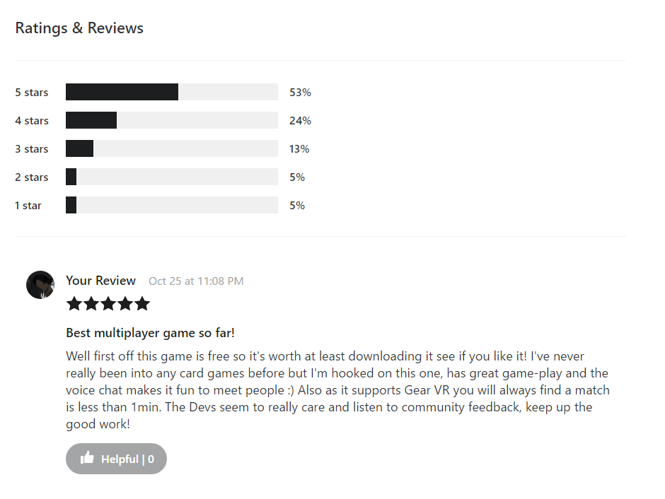 The simple review system allows those who have purchased games or applications through Oculus Home to write a review of their experiences and apply a rating out of five as a quick indicator of their satisfaction. Those star ratings are then tallied up and presented at the bottom of the game’s store presence.