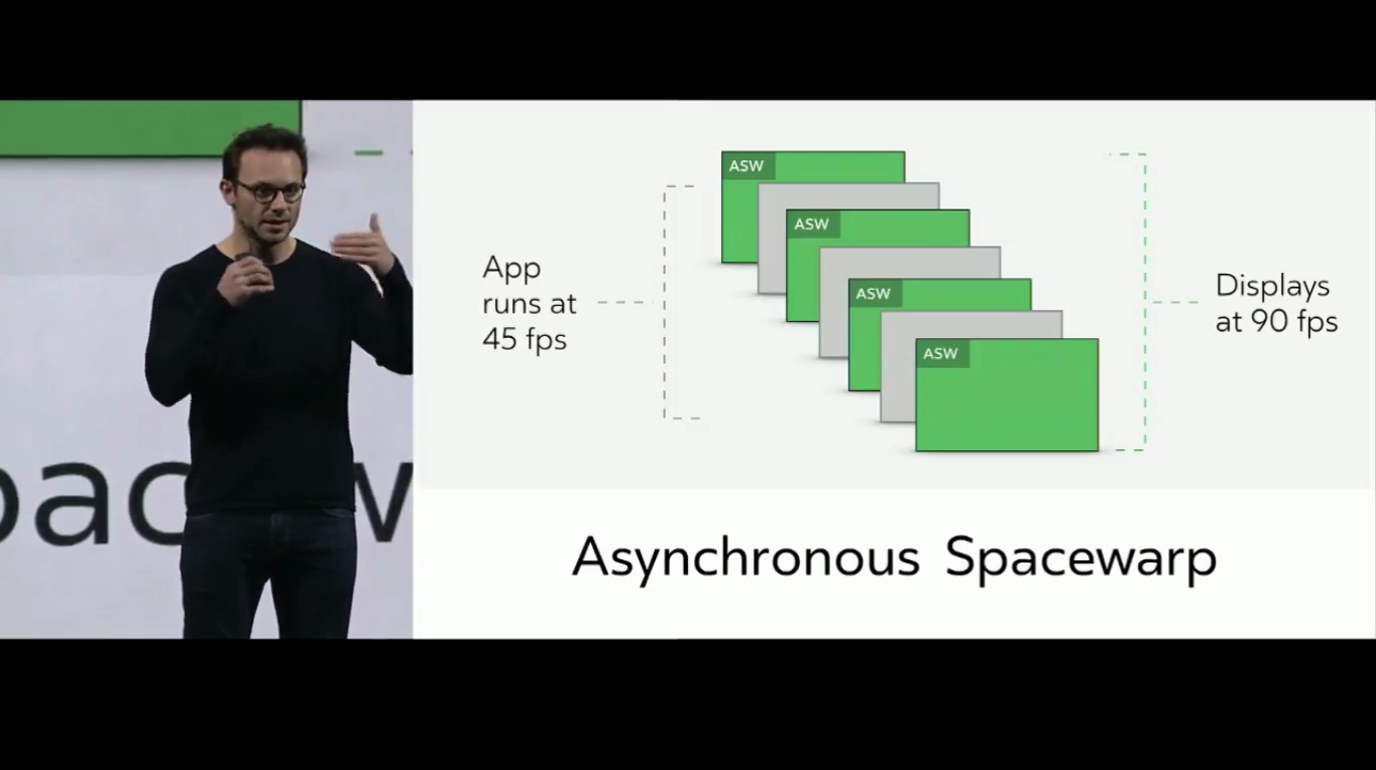 Asynchronous spacewarp is Oculus’s new solution to fix judder caused by positional movement in the playspace. As explained by Iribe, spacewarp takes the app’s two previous frames and analyzes the difference, and then calculates that difference to extrapolate and generate a new synthetic frame. This helps smooth moving objects, even the entire scene, so when you’re moving your hands or body, you won’t have judder or ghosting images. In short, it does this by halving the app’s framerate to 45 fps when it hits a snag and sandwiches in a synthetically generated frame to return it to 90.