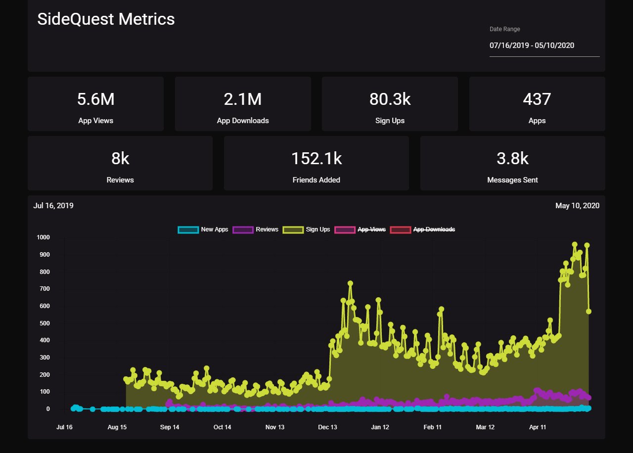 A chart tweeted by the SidequestVR account on Twitter shows some of the statistics gathered since the middle of last year. 2.1 million is the number of total unique downloads of all games from the platform while “sign ups” refers to people who set up an account with the service, which allows for automatic updates and other features.